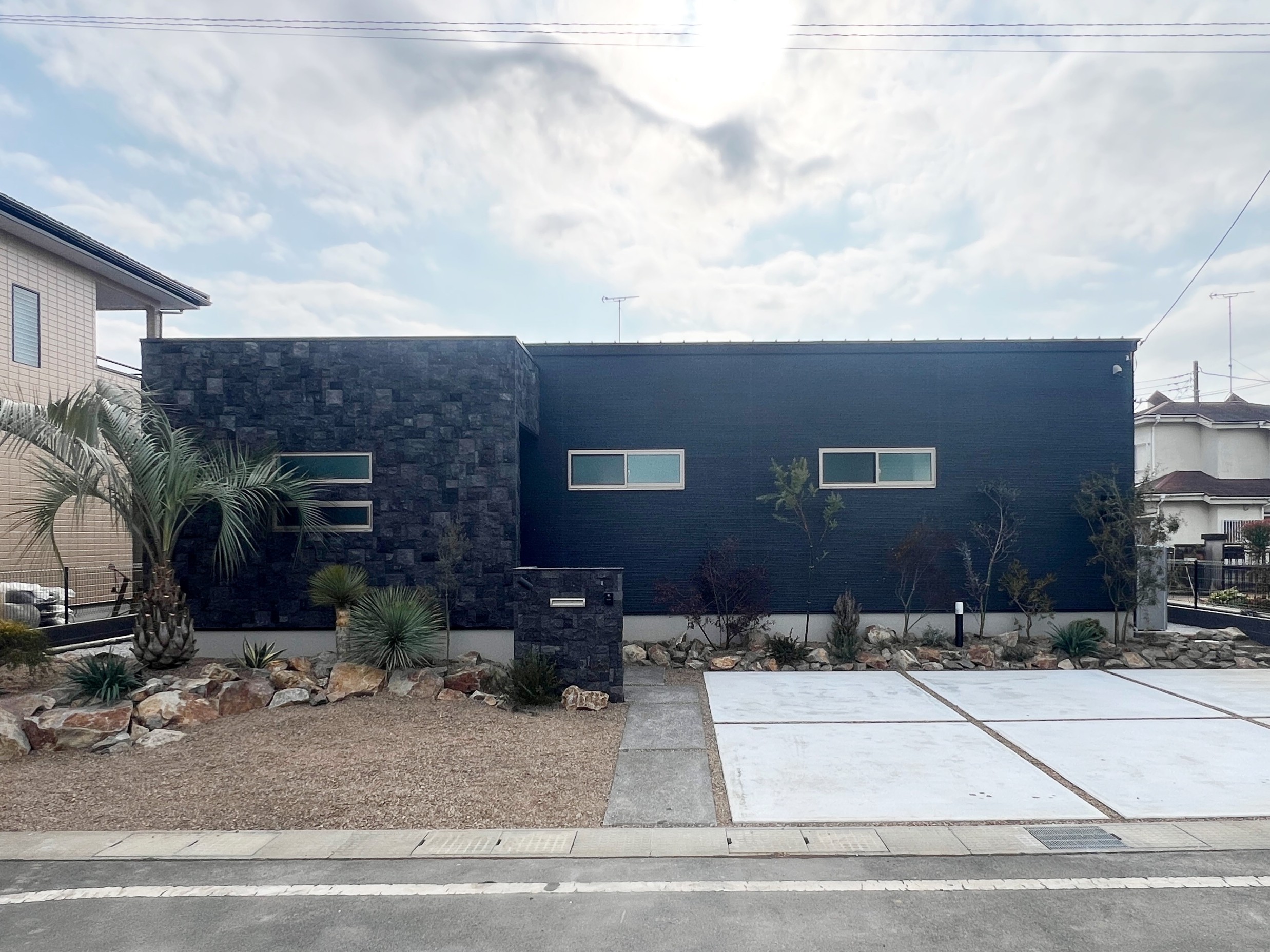 ・トロピカルな植栽や石張り門柱などで作る外構が標準施工!