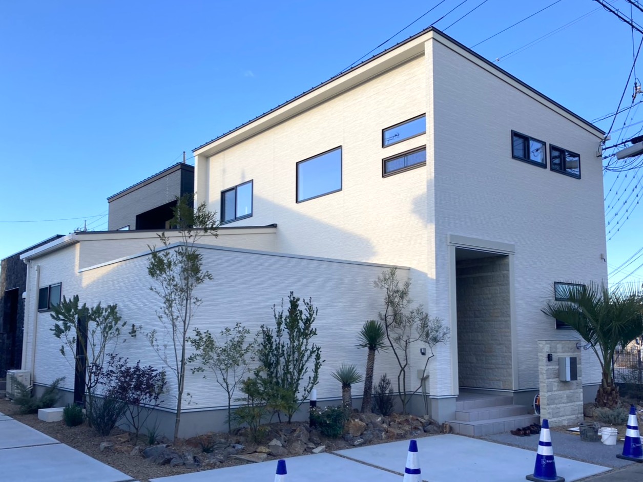 西側の黒い重厚な2階建てはアーバンモダンなデザイン!