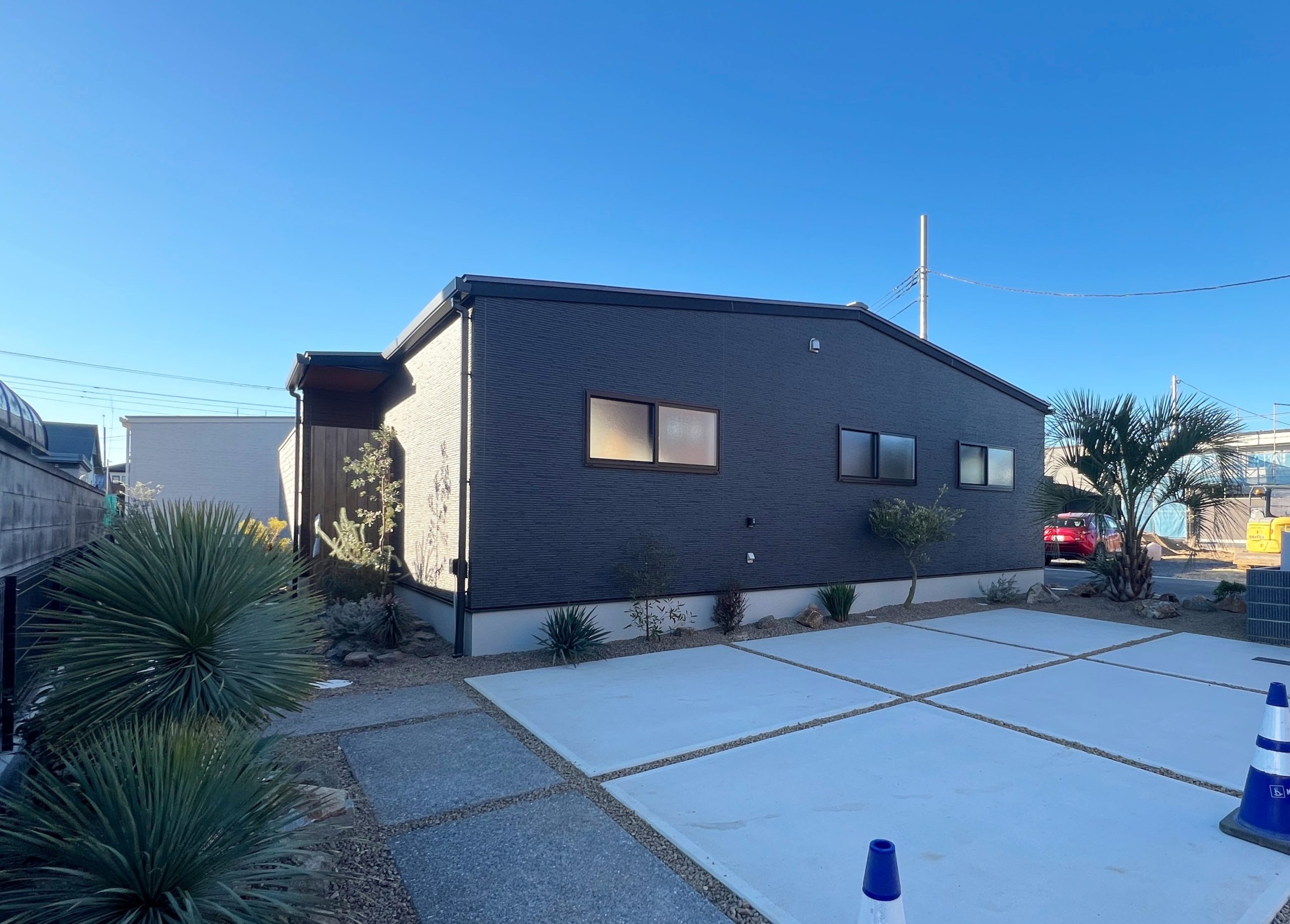 奥の旗状地には、アクセントのグレーの石壁と、ライトグレーの外壁の上品なお家。