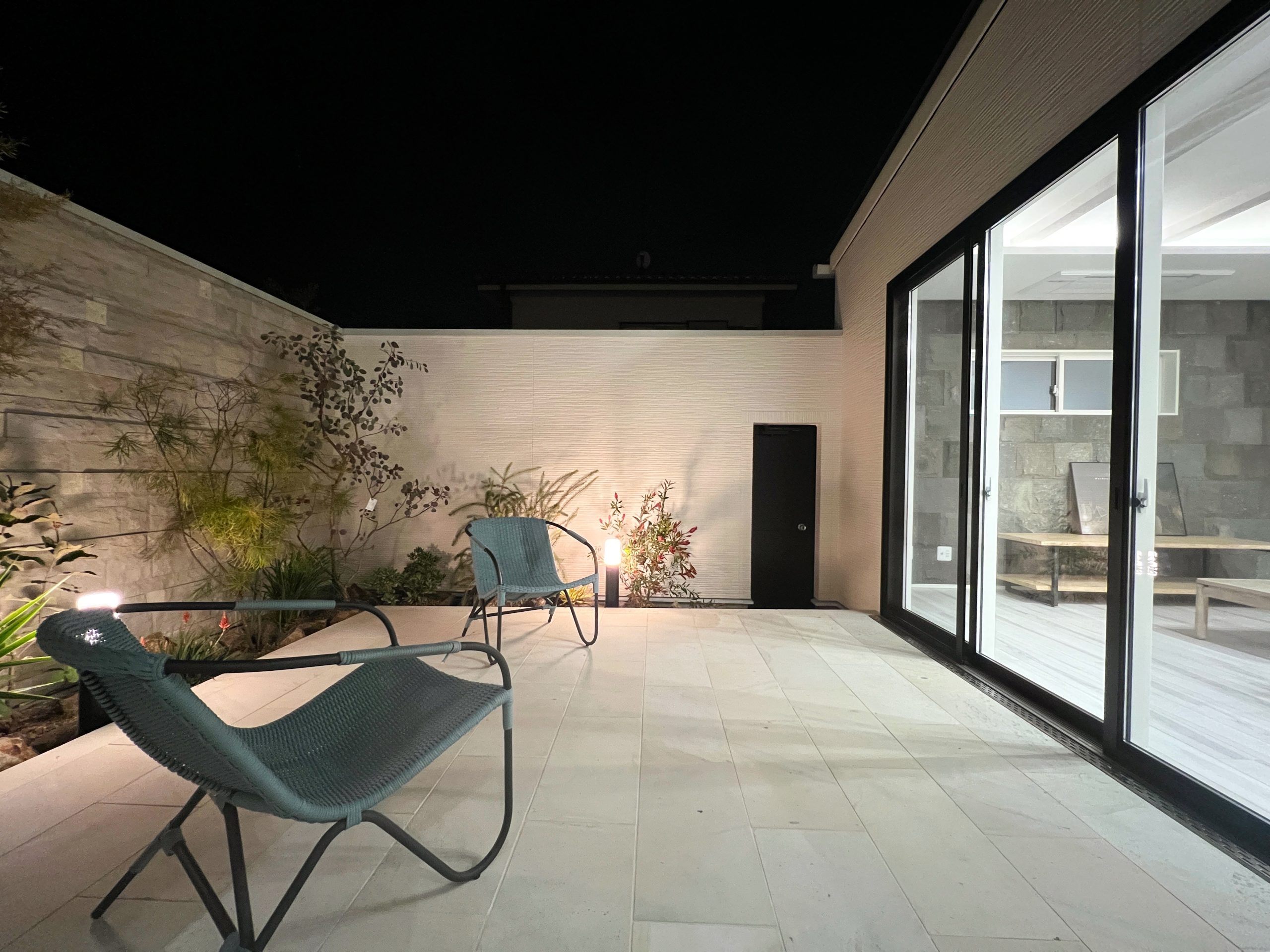 21帖のLDKは、折上天井と石壁がアクセントのデザイン空間。テラスとフラットに繋がる空間は開放的!目隠し壁付きなので、外からの視線を気にせずゆったりとお過ごしいただけます。