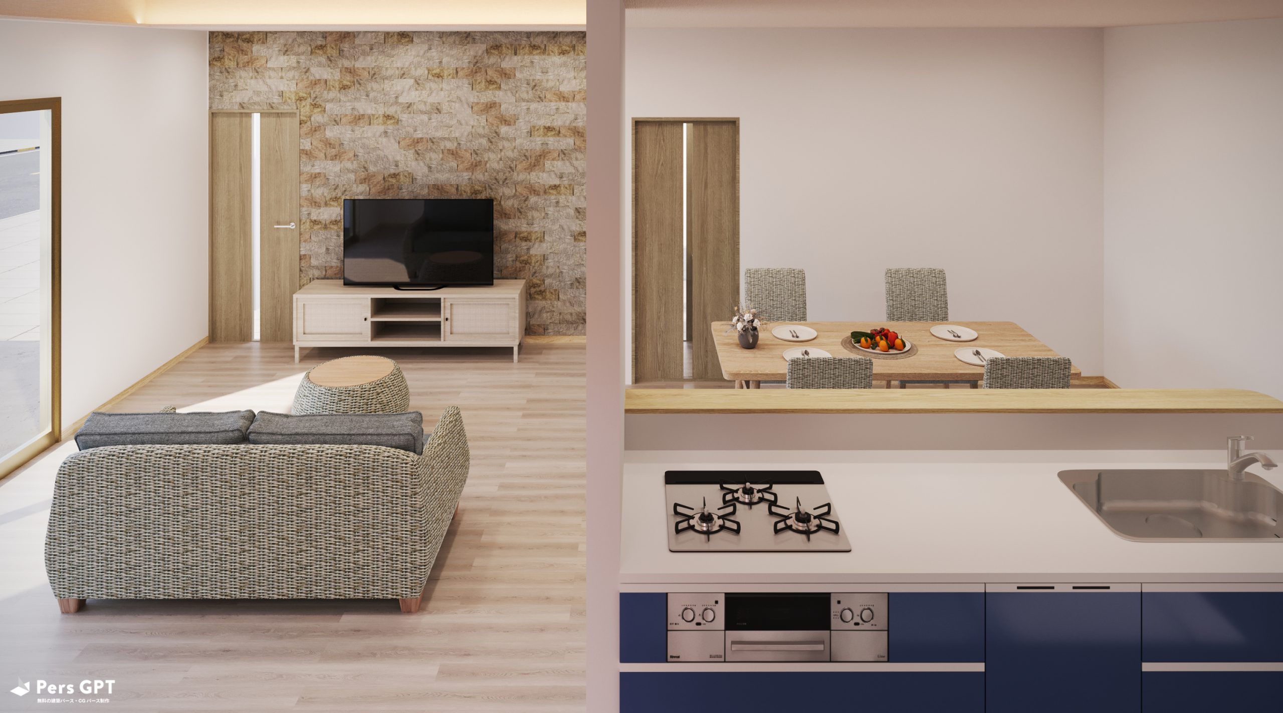 リビングとダイニングがセパレートタイプの2号棟。食事をする場所と、ソファで寛ぐ場所が分かれているため、空間を有効活用していただけます。