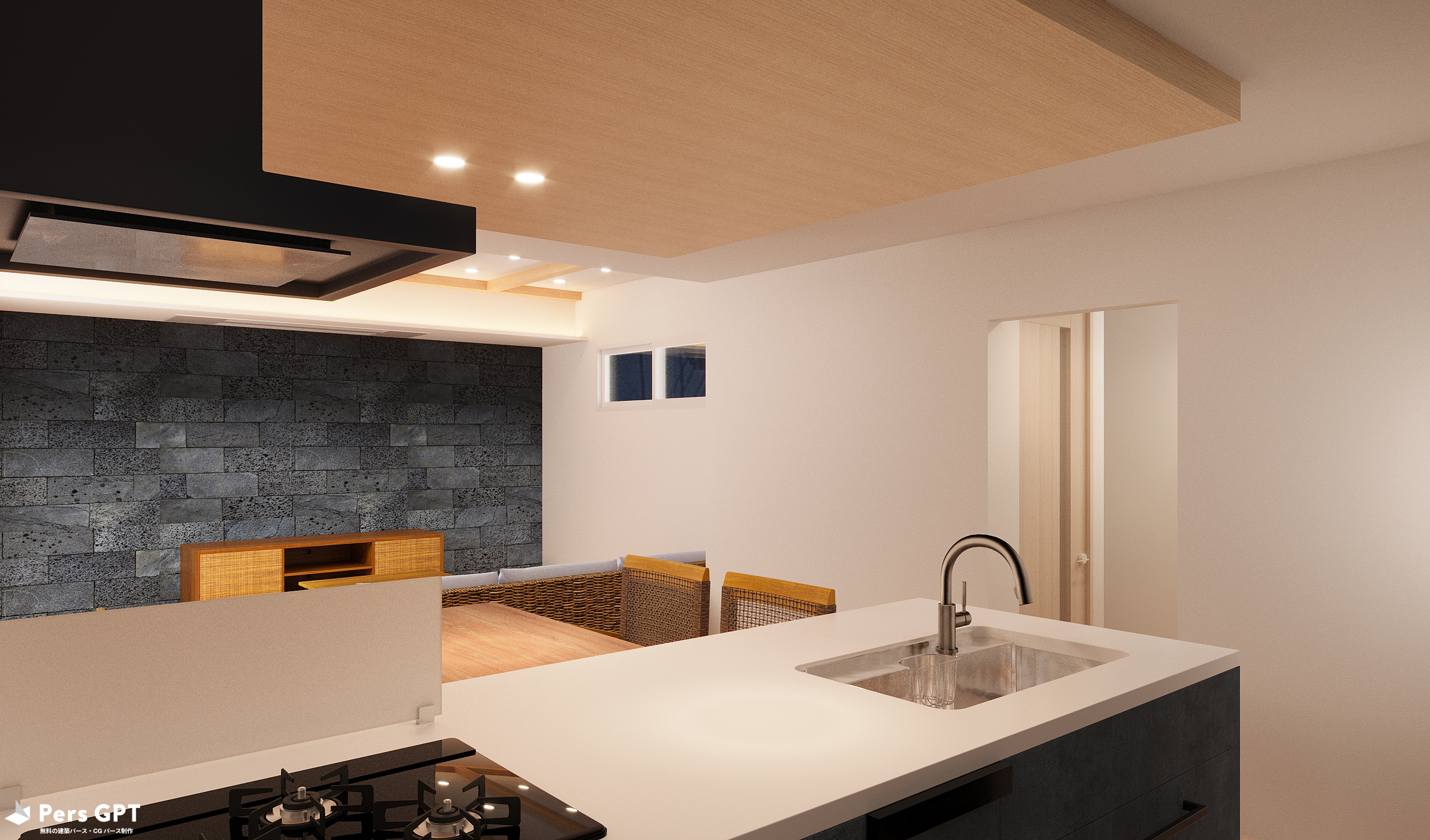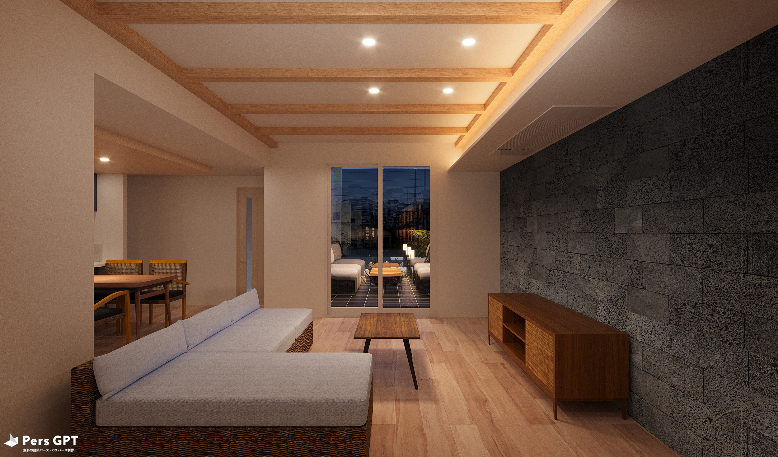 石貼りの壁と折り上げ天井の空間は、Kayu styleの家具がコーディネートされたおしゃれなリゾート。また、天カセエアコン付きです。温水式床暖房もついて、冬も足元から温かく快適です。 ※画像・パースはイメージの為、実際とは異なります。