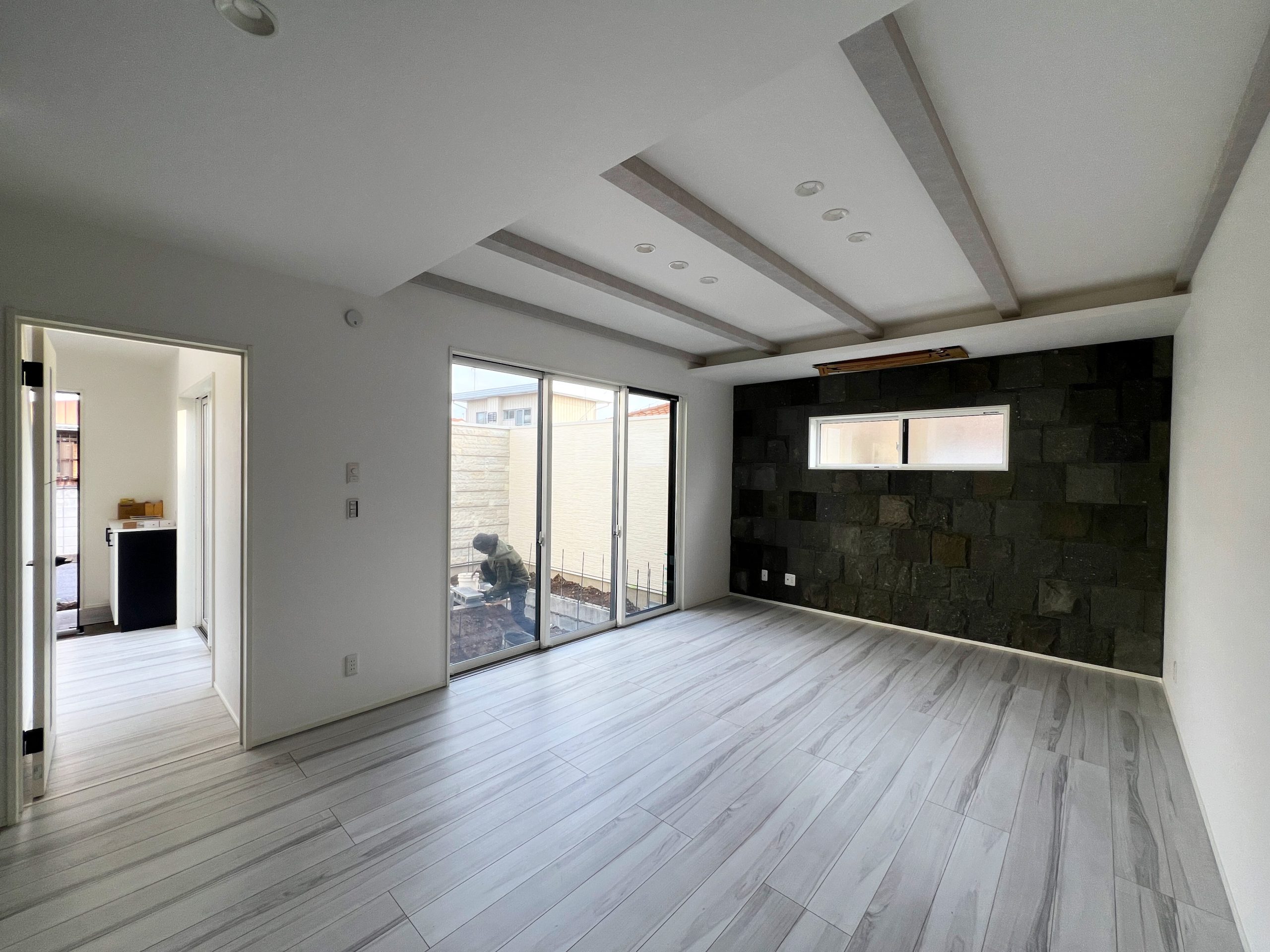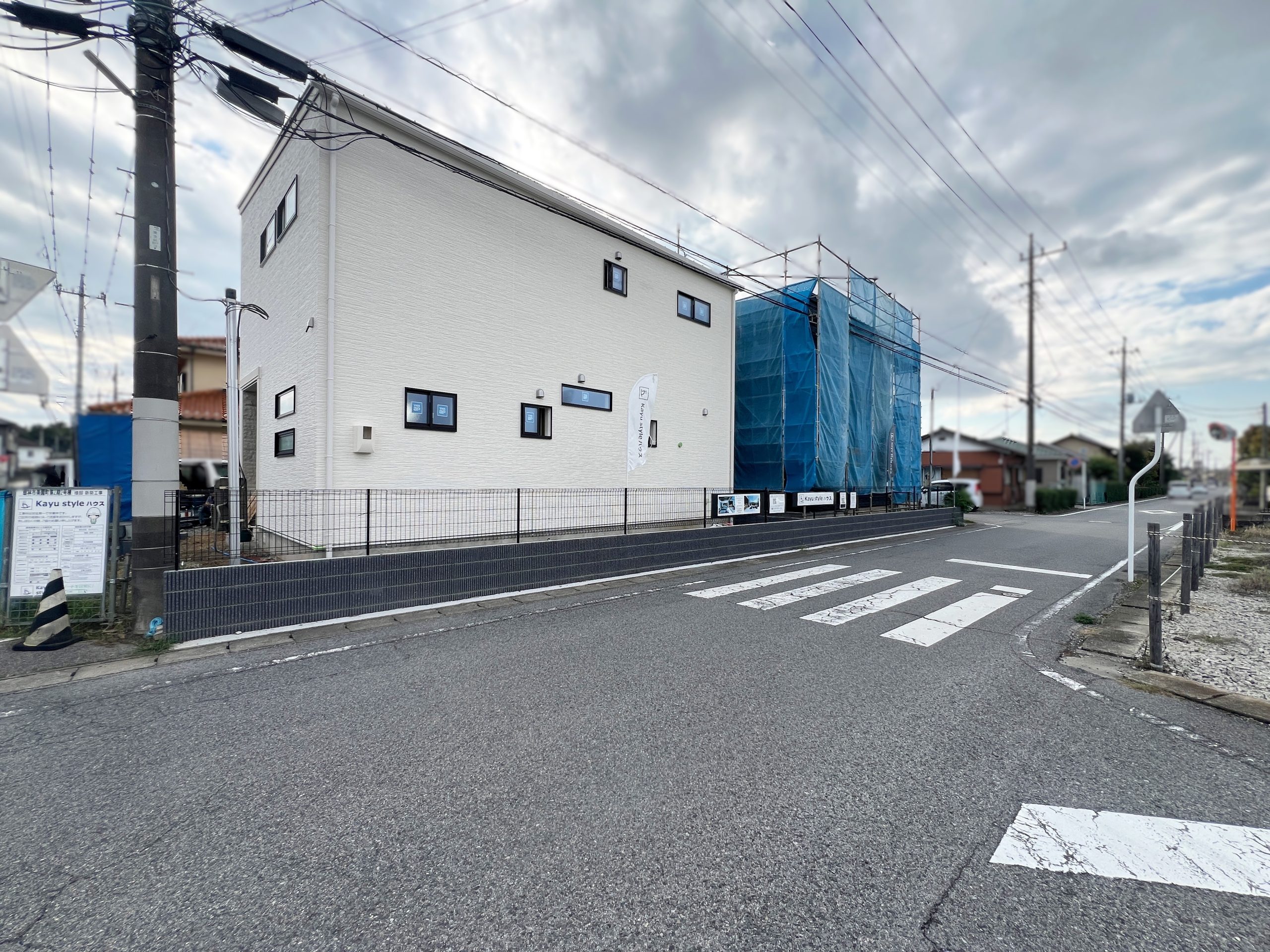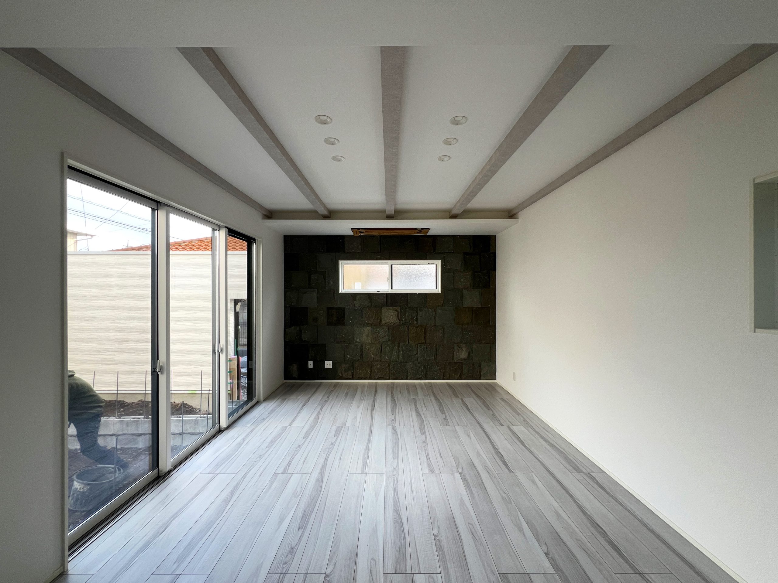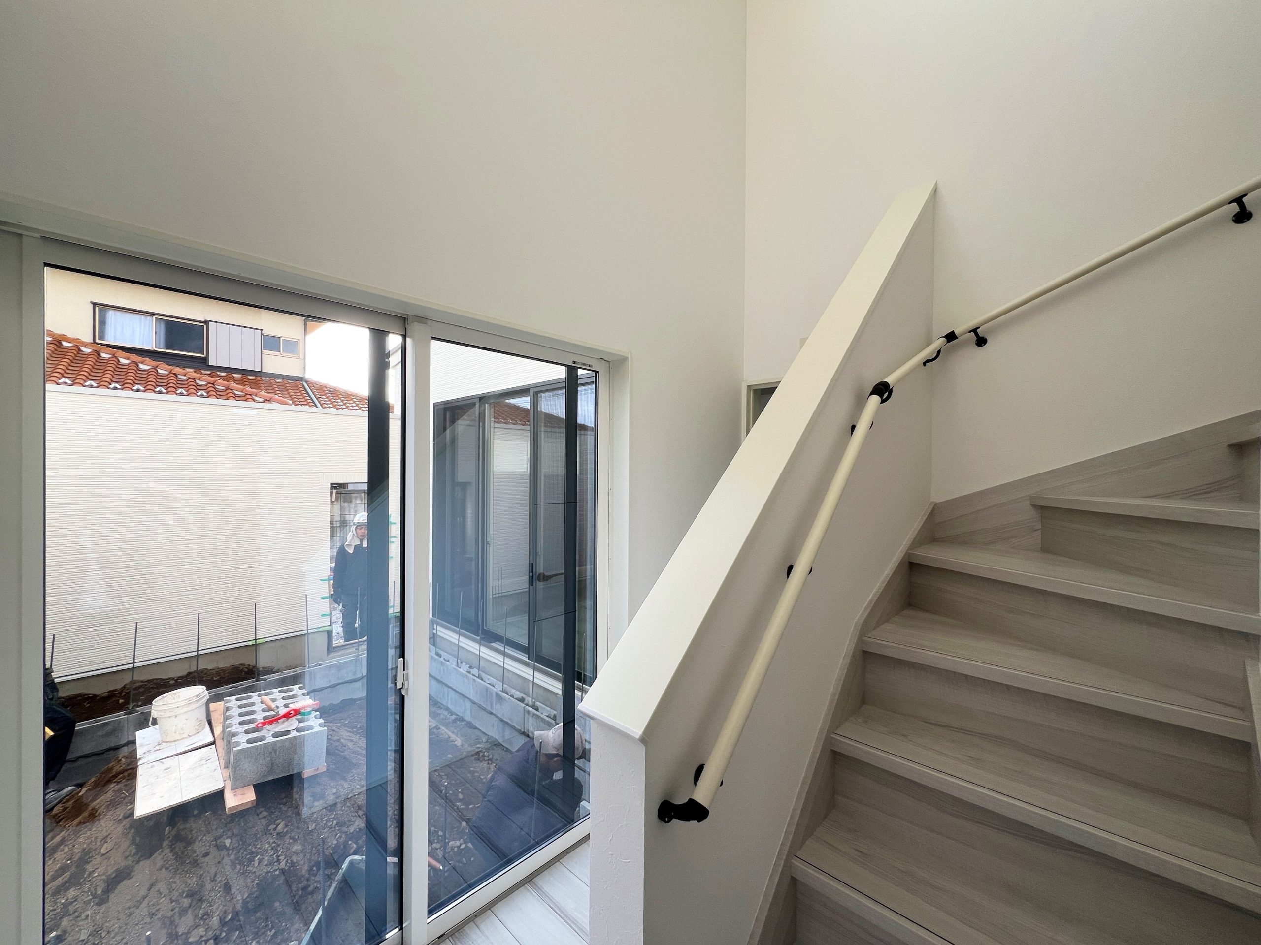 見せタル木のある勾配天井の17.5帖のLDKは、おしゃれでモダンな空間です!テラスとフラットに繋がり、ゆったりと心地良くお過ごしになれます。通路とリビングから出入りできるテラスは、目隠し壁で囲われていて外からの視線が気にならないプライベート空間になっております。扉がついているので、テラスから外にも行くことが可能です。玄関ホールの通路は吹抜けになっている為、明るく開放的!キッチン裏の水回りから、階段を中心に回遊できるので家事動線も良好です!