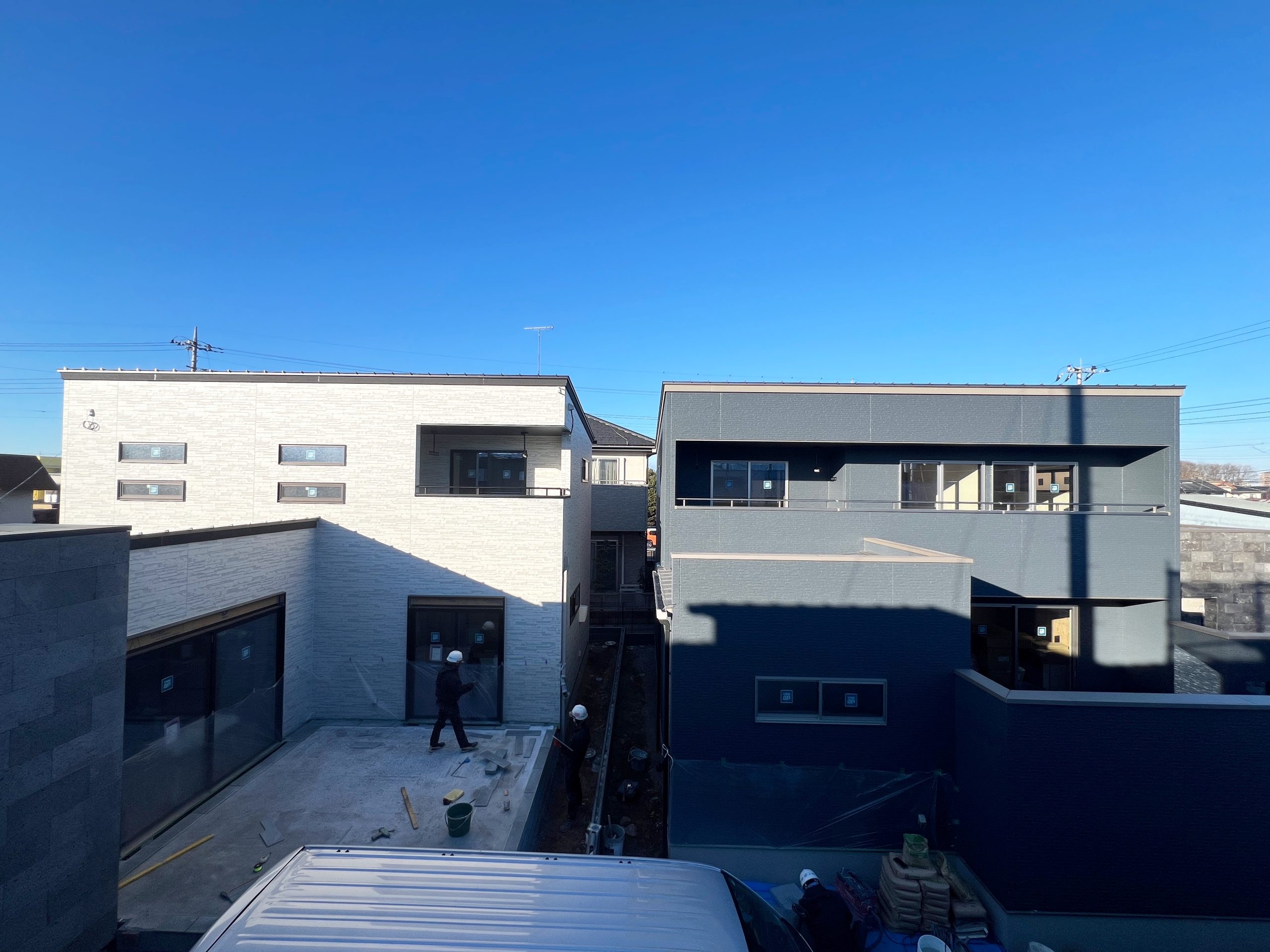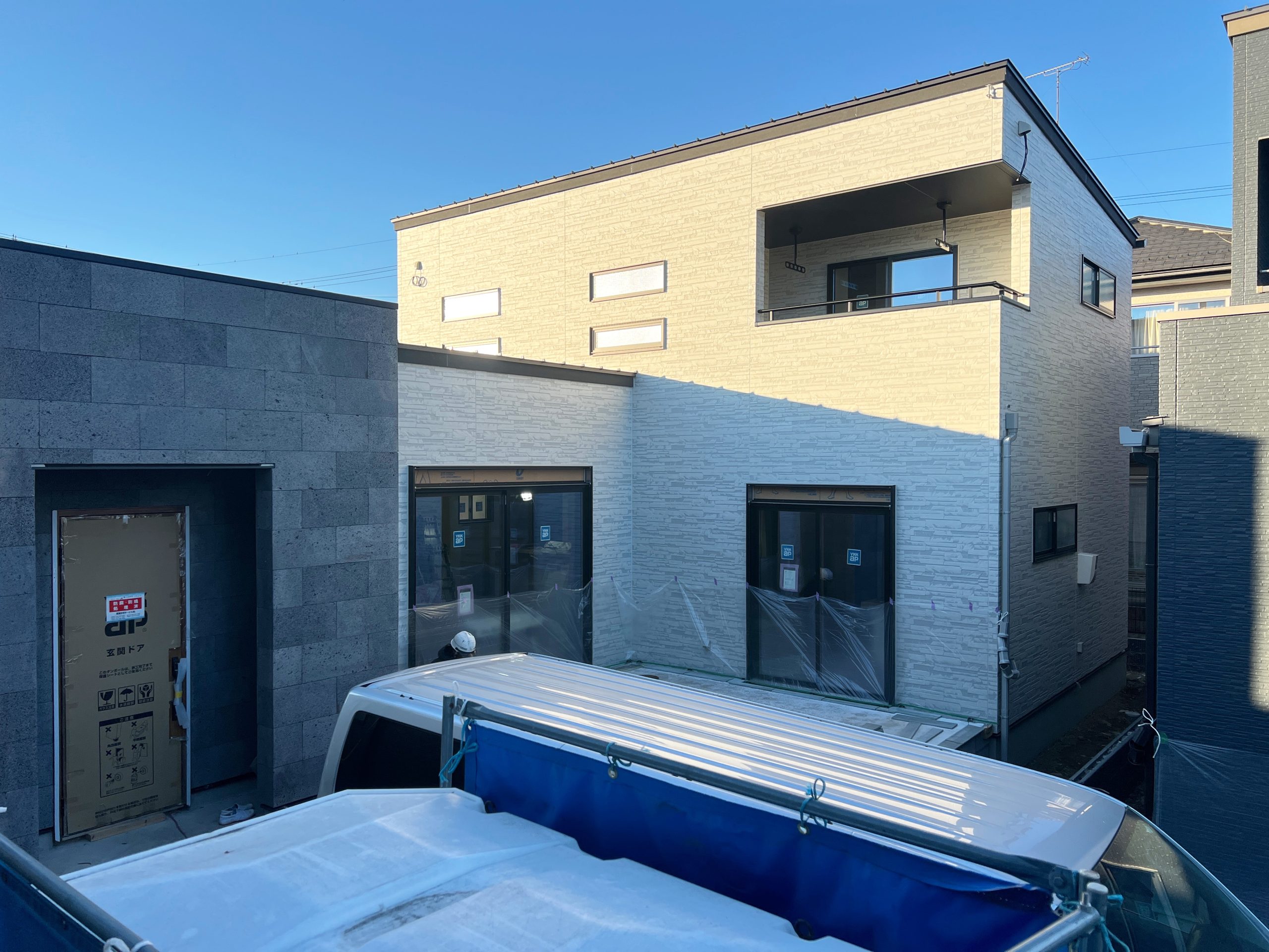 奥の旗状地には、アクセントのグレーの石壁と、ライトグレーの外壁の上品なお家。