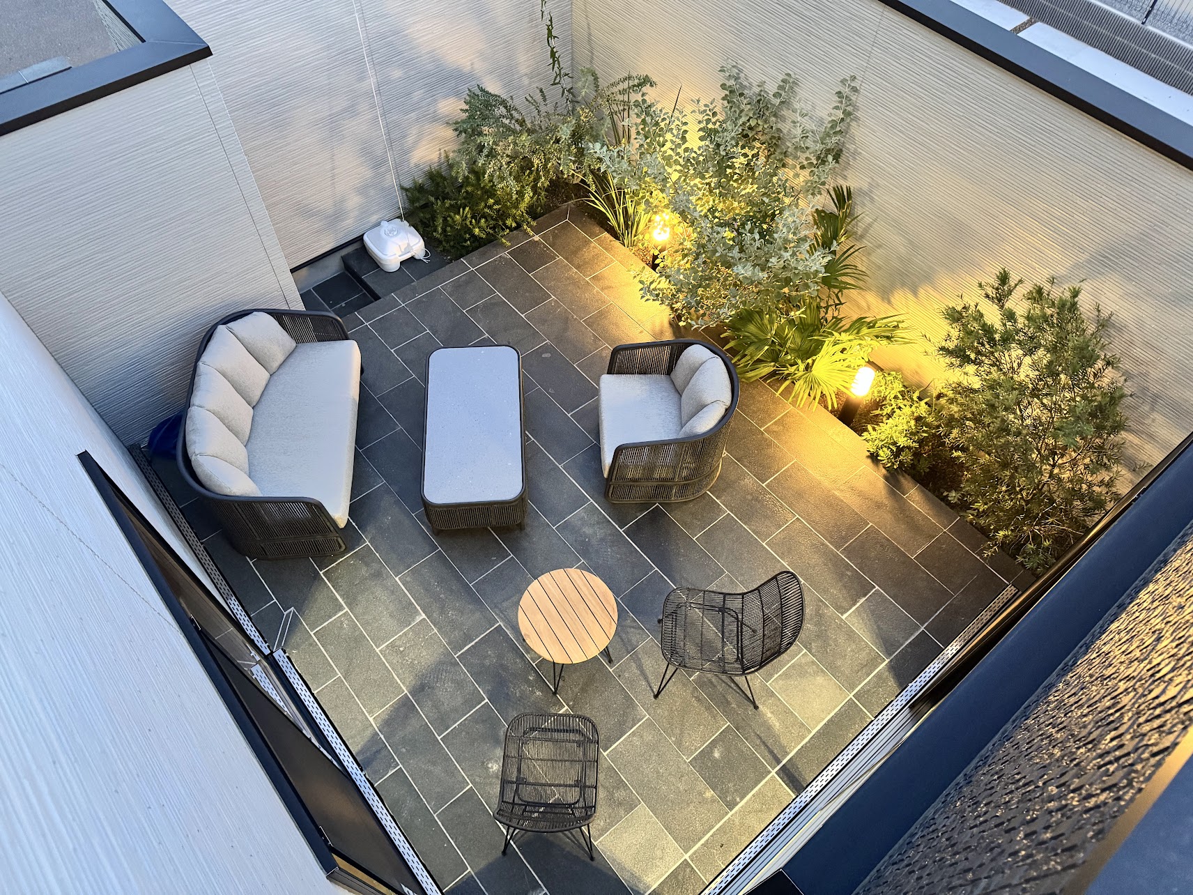 リビングとフラットに繋がるテラスは、目隠し壁に囲われた中庭にような空間。外からの視線を気にせずにカーテンいらずでお過ごしになれます。※画像はイメージの為、実際とは異なります。