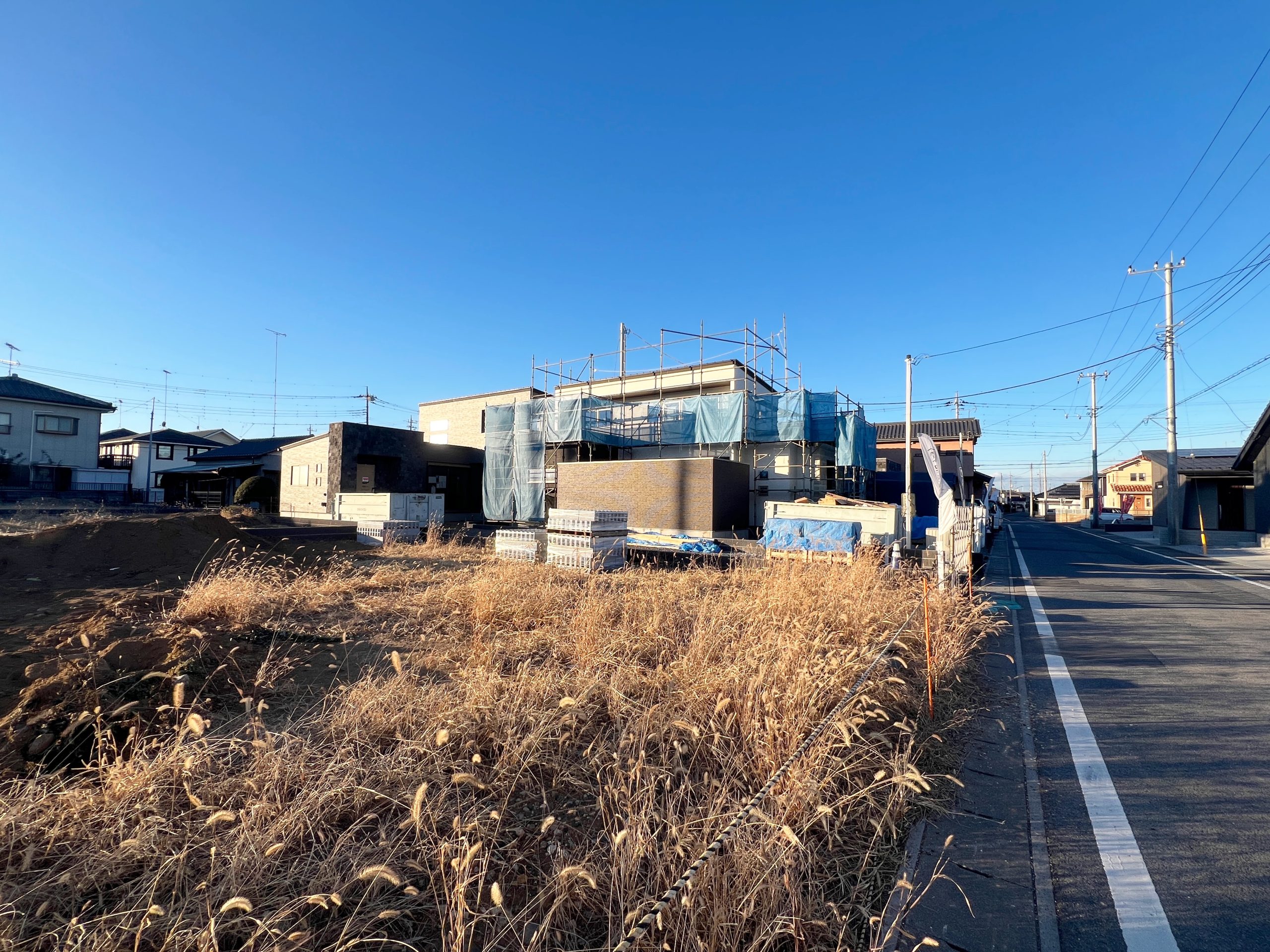 奥の旗状地には、アクセントのグレーの石壁と、ライトグレーの外壁の上品なお家。