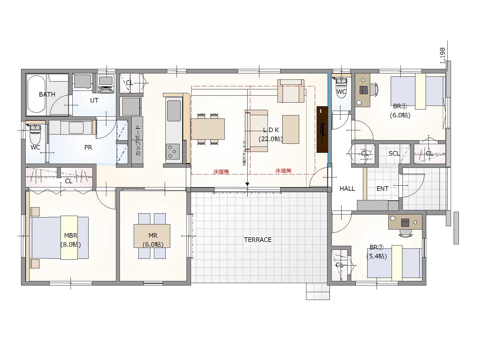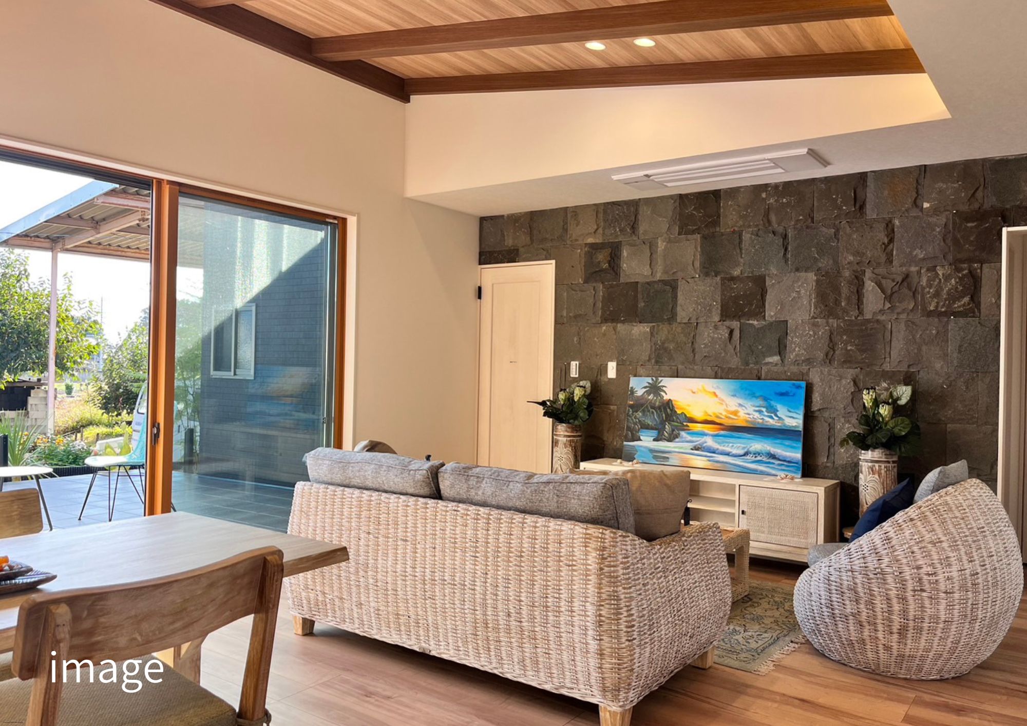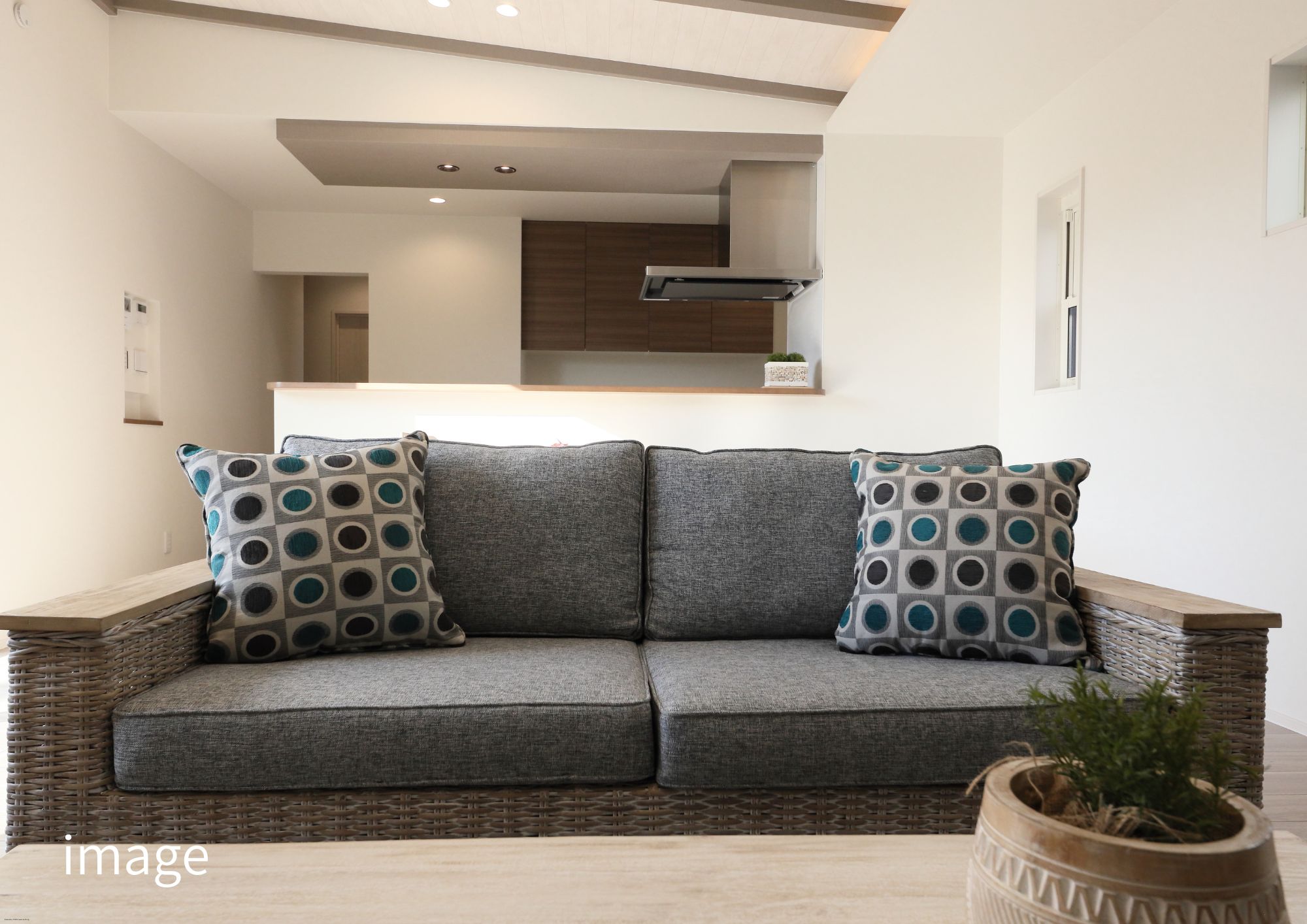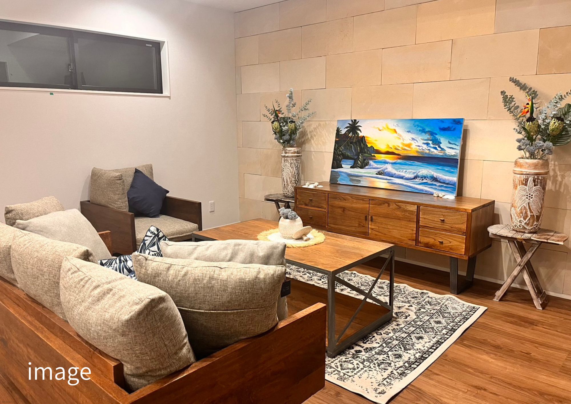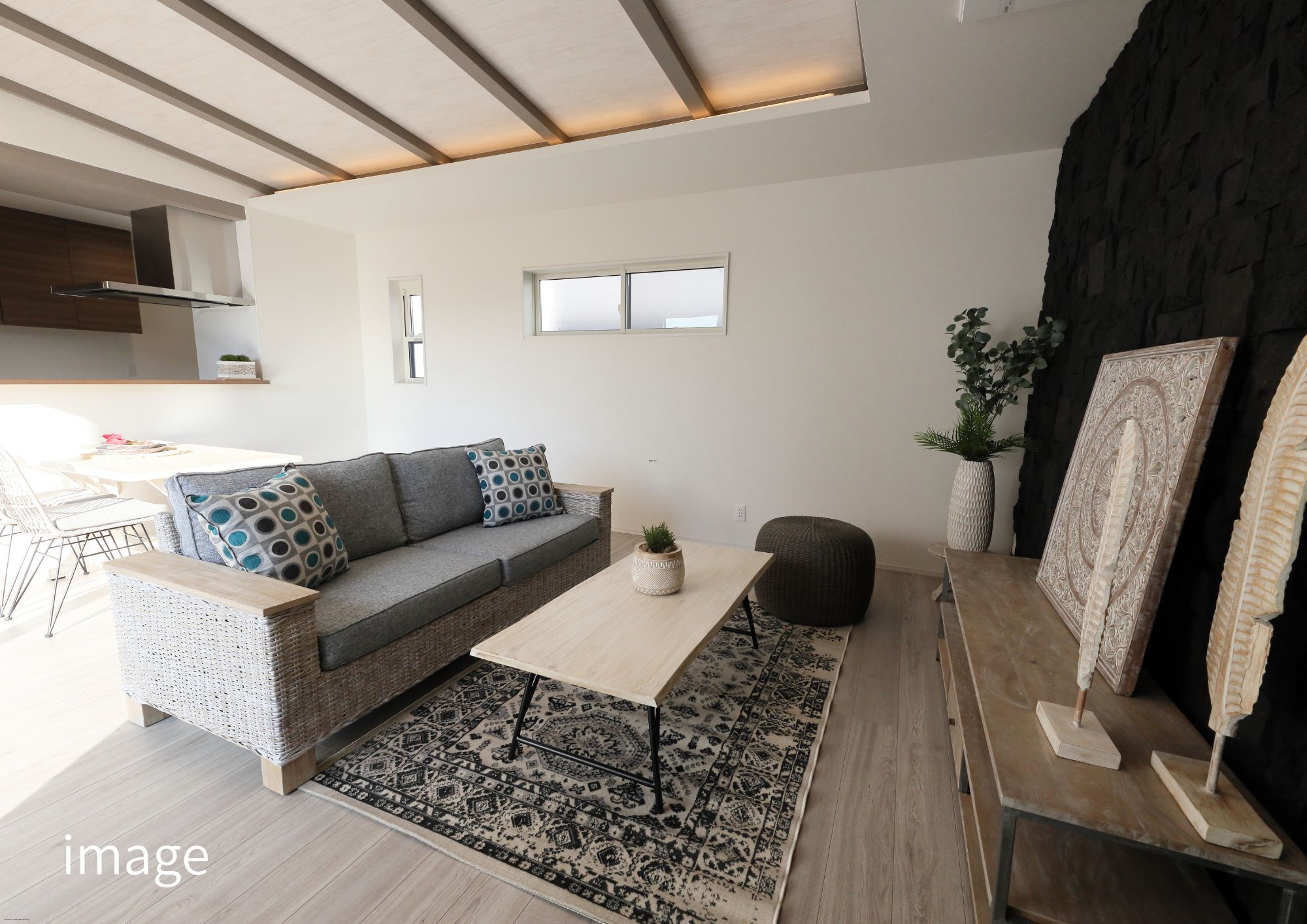 開放的な約22帖広々LDK! 天井が高く、家族団らん癒しのスペース。 Kayu styleの家具でコーディネートされたリゾート空間。 温水式床暖房付きで冬も足元から暖かく快適にお過ごしいただけます。 ※画像・パースはイメージの為、実際とは異なります。