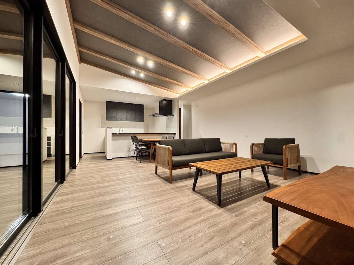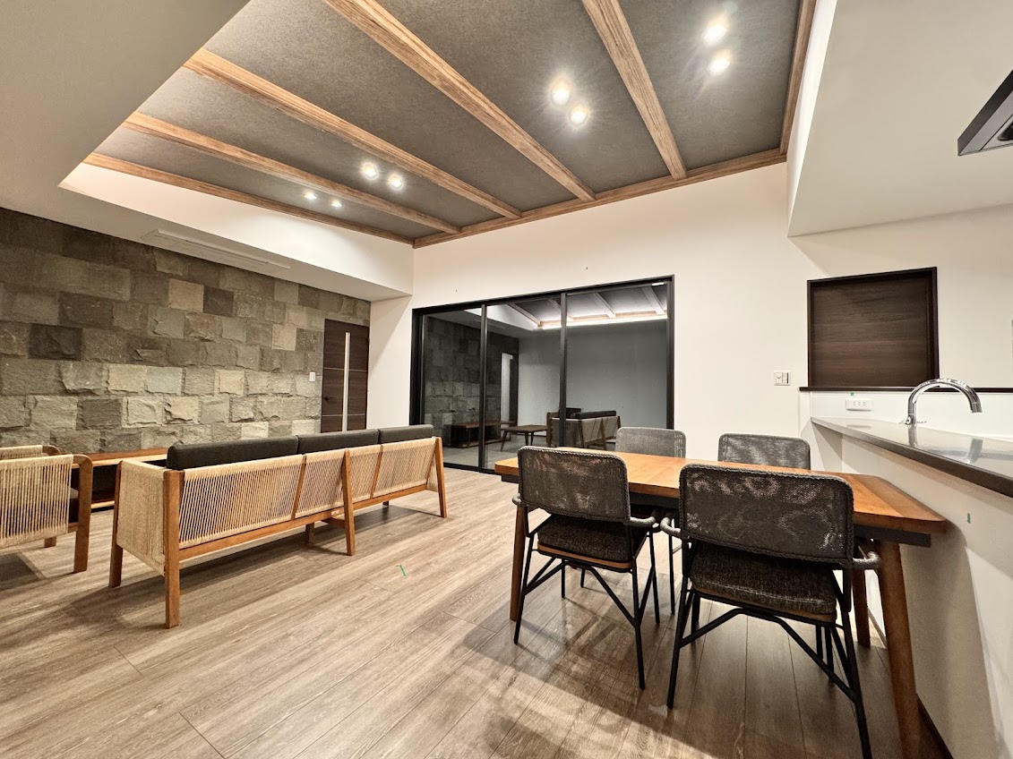 リビングは空間の広がりを演出してくれる勾配天井になっていて、間接照明のやわらかな光に癒されます。リビングからフラットに繋がるテラスは、目隠し壁と南国の植栽に囲まれているのでご家族だけのプライベートリゾートを愉しむことができます。