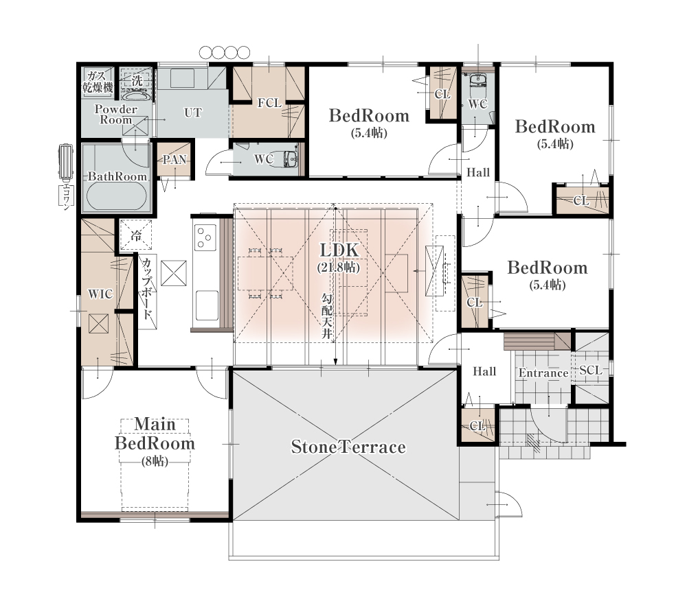 それぞれのお部屋にクローゼットがあり、更にファミリークローゼット、パントリーなど、ご家族が多くても安心の収納力のプランです。