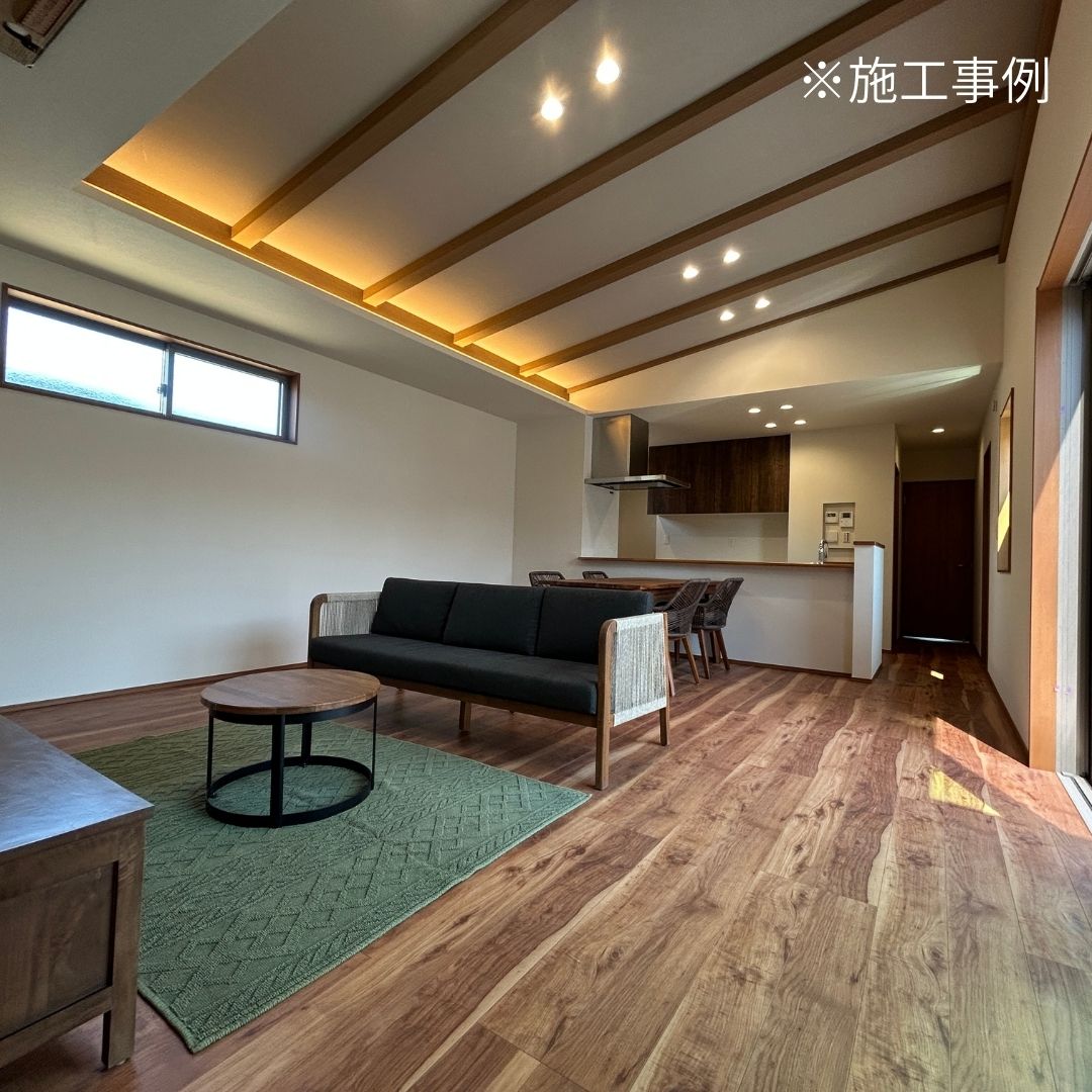 リビングは意匠性を備えた勾配天井とやわらかな光を放つ間接照明、そして統一感のあるインテリアにより、ホテルさながらの心地よい上質な空間が広がります。分譲地仕様により天井は異なりますので詳しくはお問合せください。
