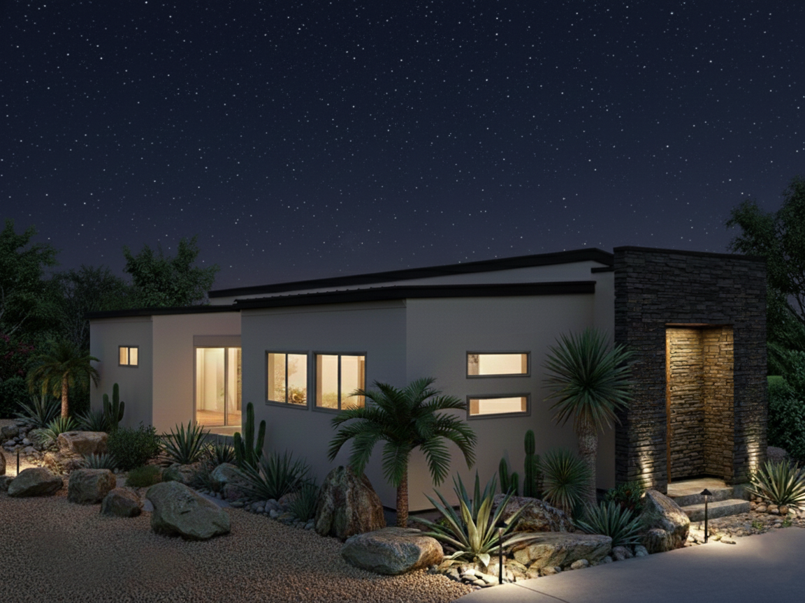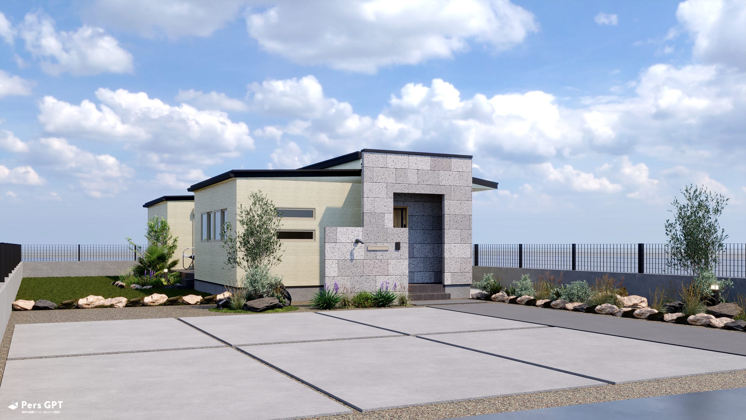建物を彩るトロピカルな植栽のドライガーデンが愉しめる外構付きです。ライトアップの照明も付いて帰宅が愉しみになる雰囲気 ※画像・パースはイメージの為、実際とは異なります。