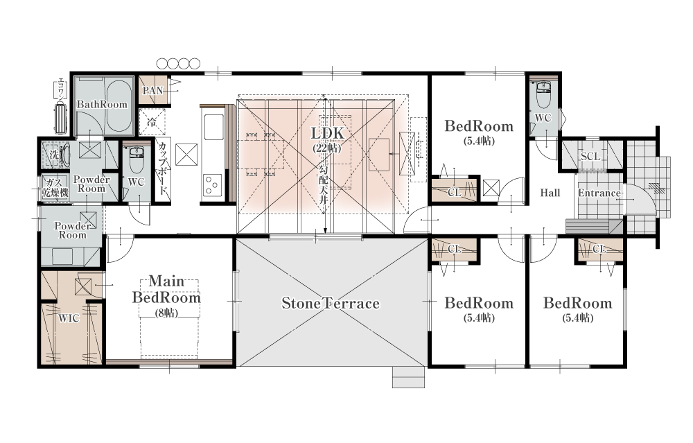 22帖のLDKは、勾配天井と石壁がアクセントのデザイン空間。テラスとフラットに繋がる空間は開放的で、ゆったりとお過ごしいただけます。