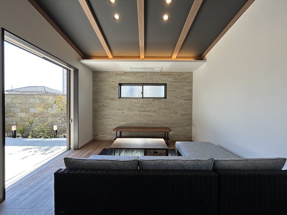 インドネシア産の石壁が一面に貼られた高級感あるリビング。
