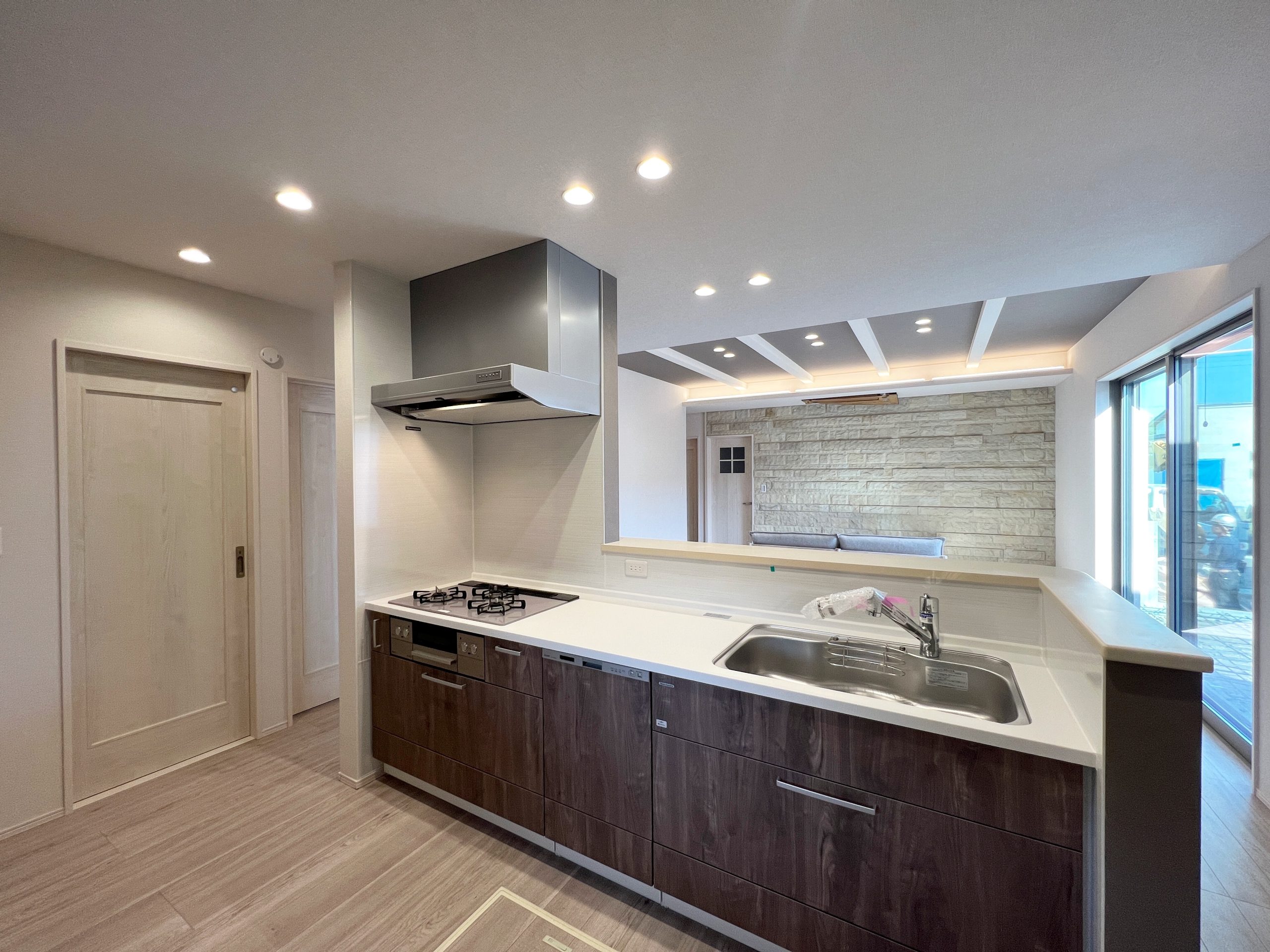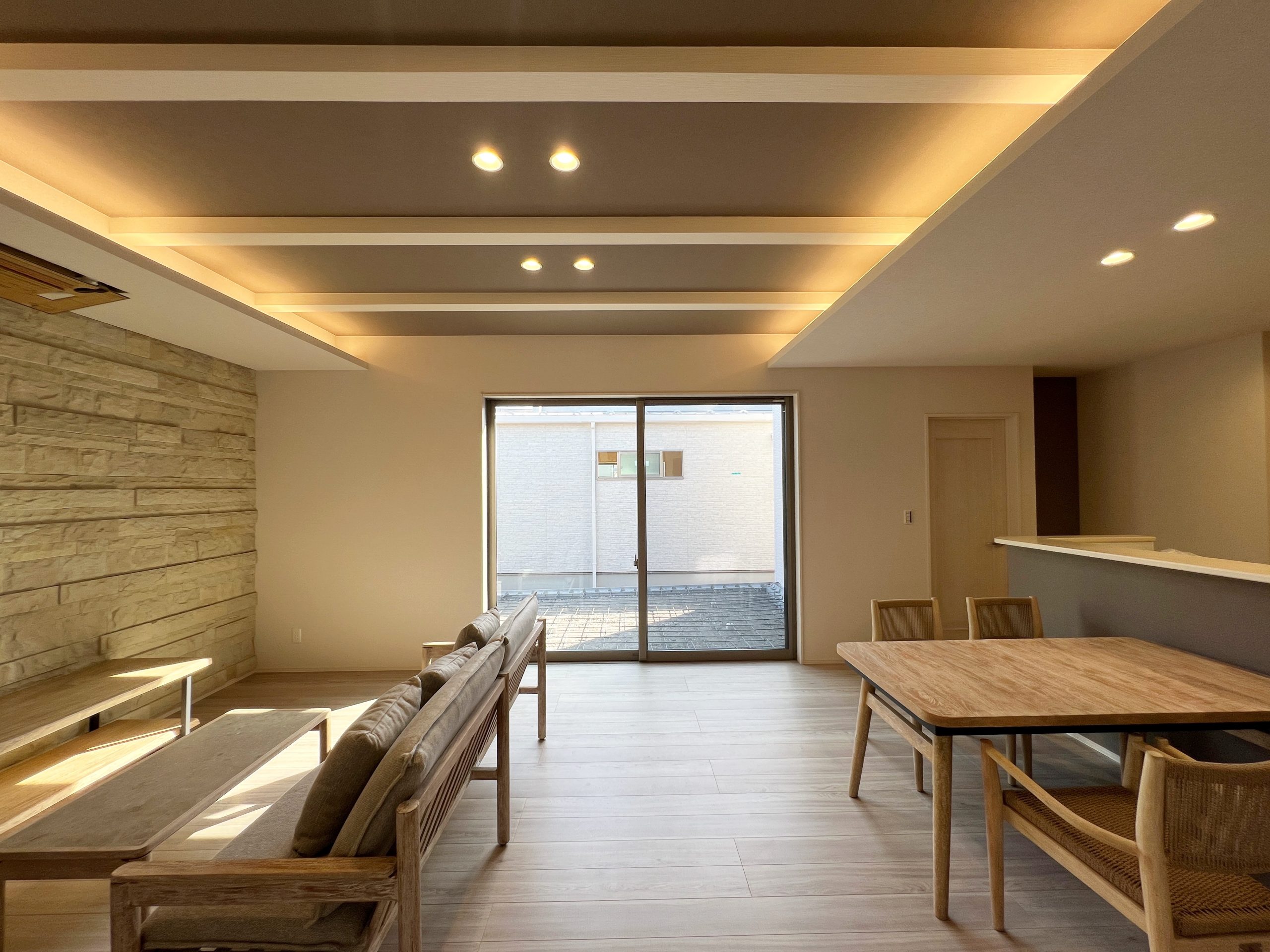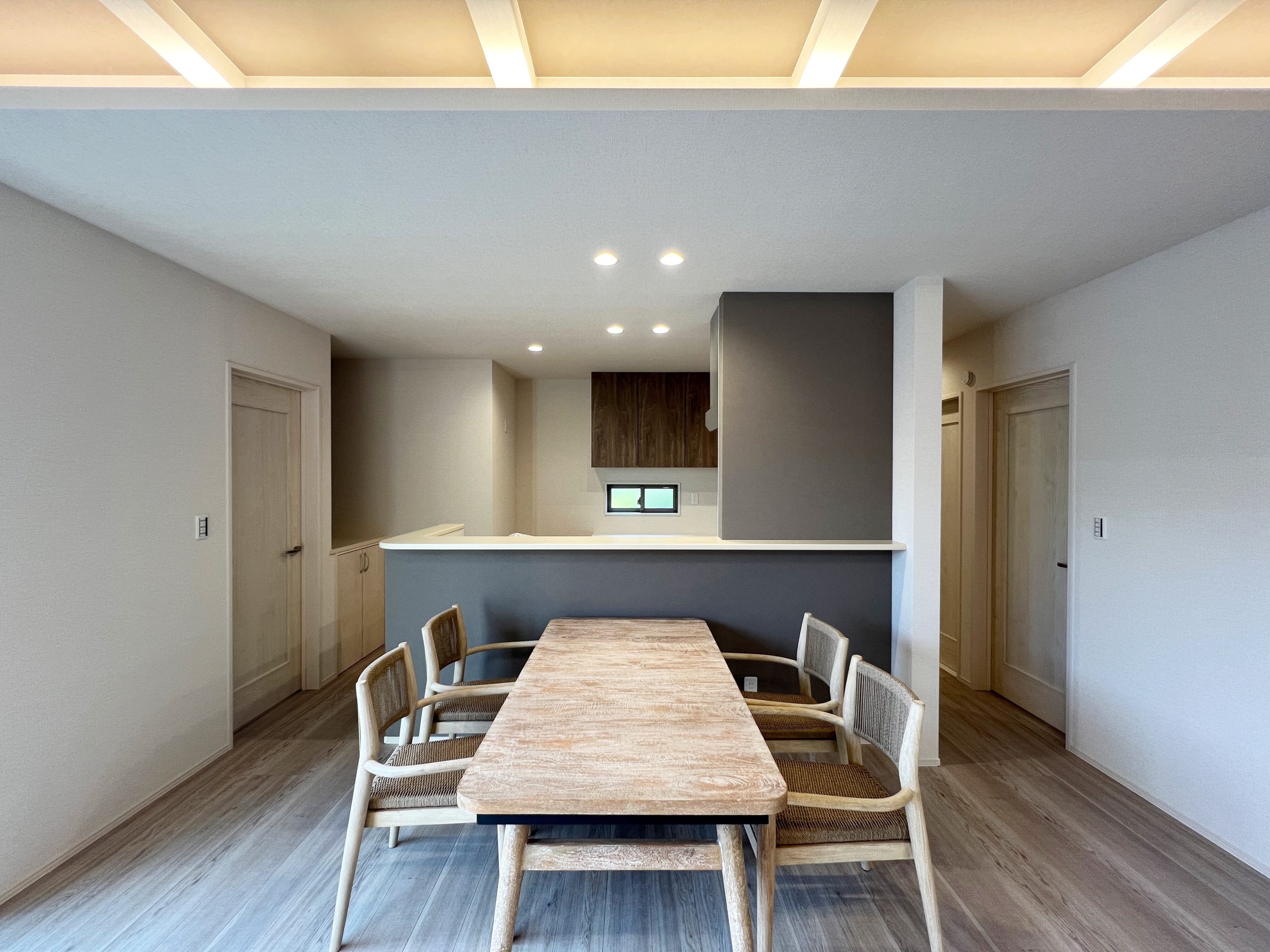 21帖ほどのLDKは勾配天井で圧迫感もなく、対面キッチンは壁がなくオープンなので、より広くゆったりと感じるくつろぎの空間です。テラスはⅬ字型に囲い、道路面には目隠しスクリーンも設置。日常に自然とリゾートの暮らしが馴染んでいくような住宅です。