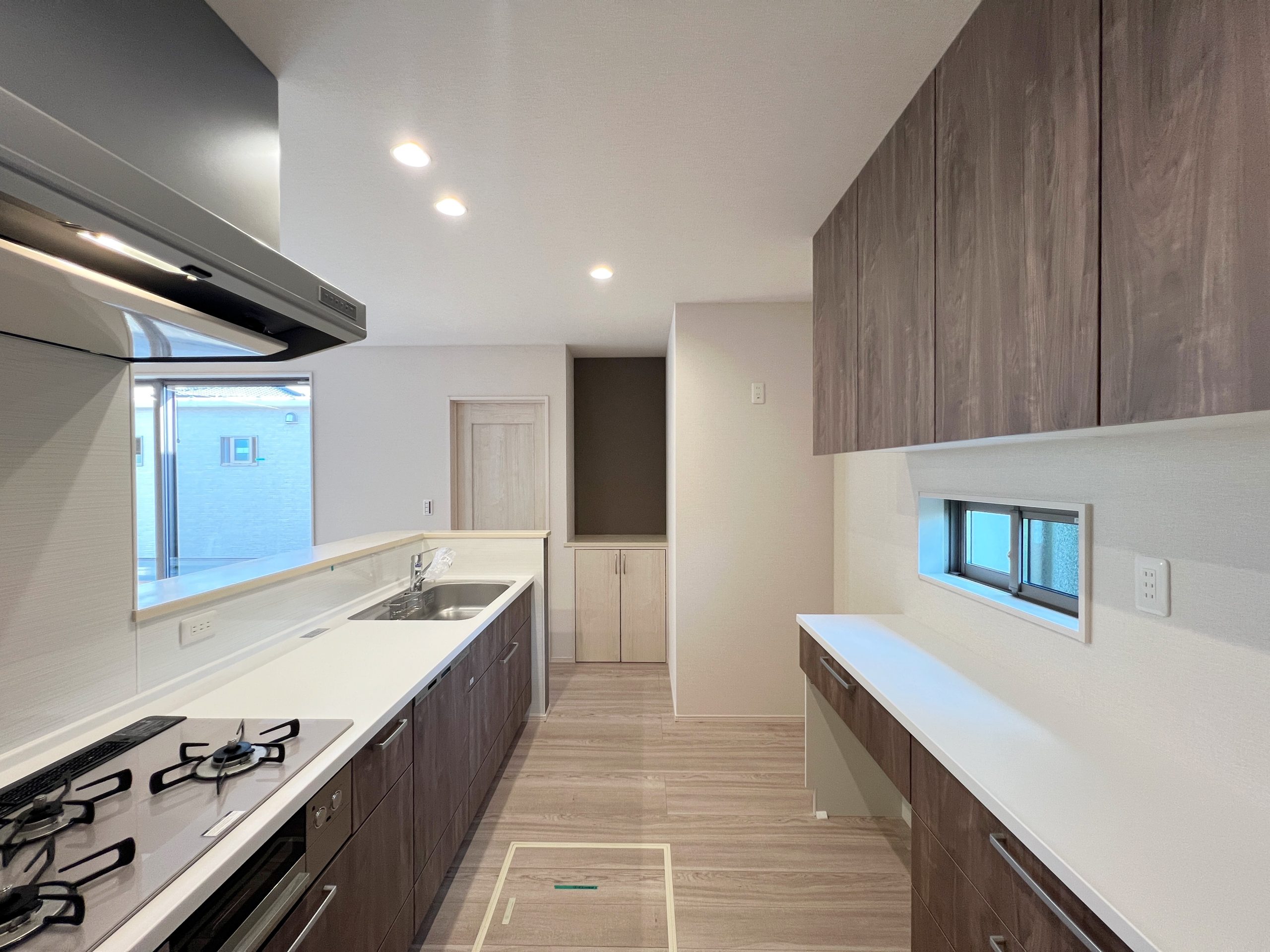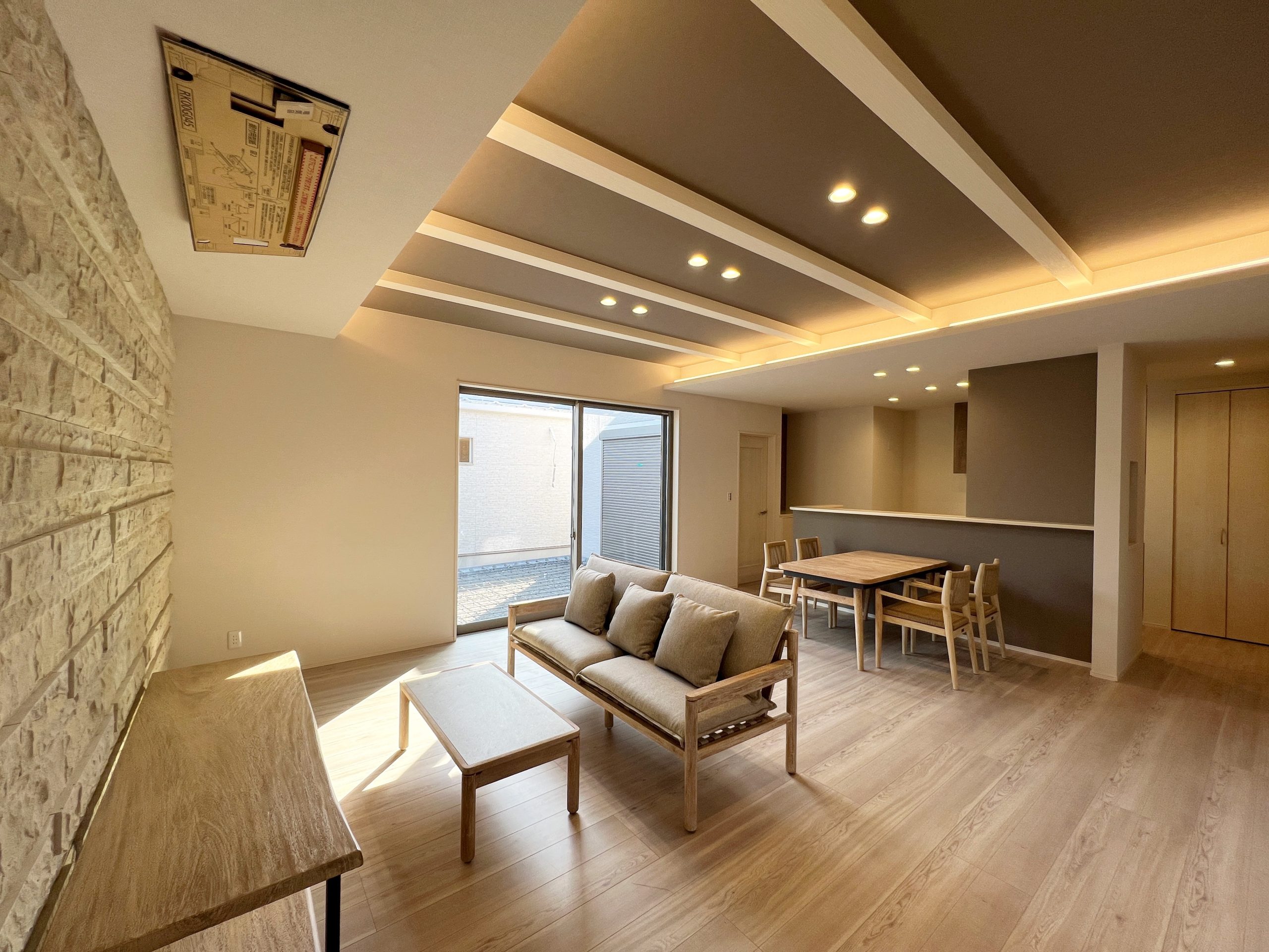 ナチュラルモダンな1号棟は、木目と明るいトーンの色調のコーディネート。