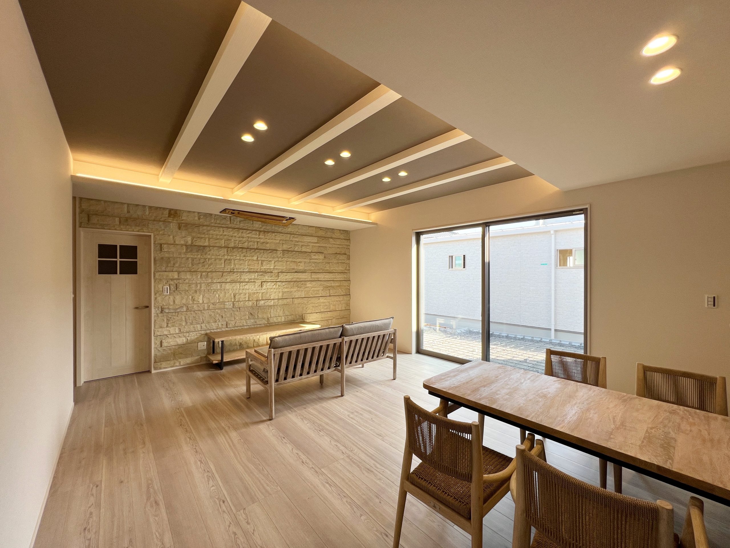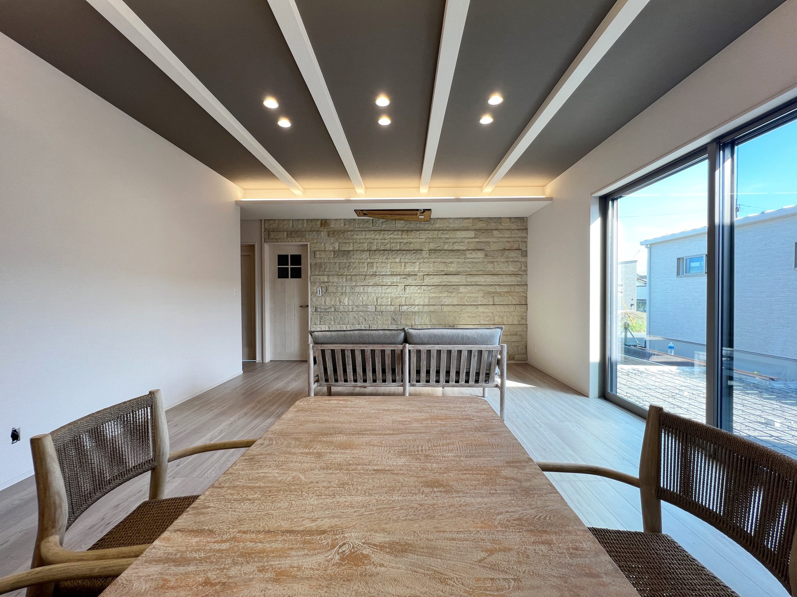 石貼りの壁と折り上げ天井の空間は、Kayu styleの家具がコーディネートされたおしゃれなリゾート。また、天カセエアコン付きです。温水式床暖房もついて、冬も足元から温かく快適です。 ※画像・パースはイメージの為、実際とは異なります。