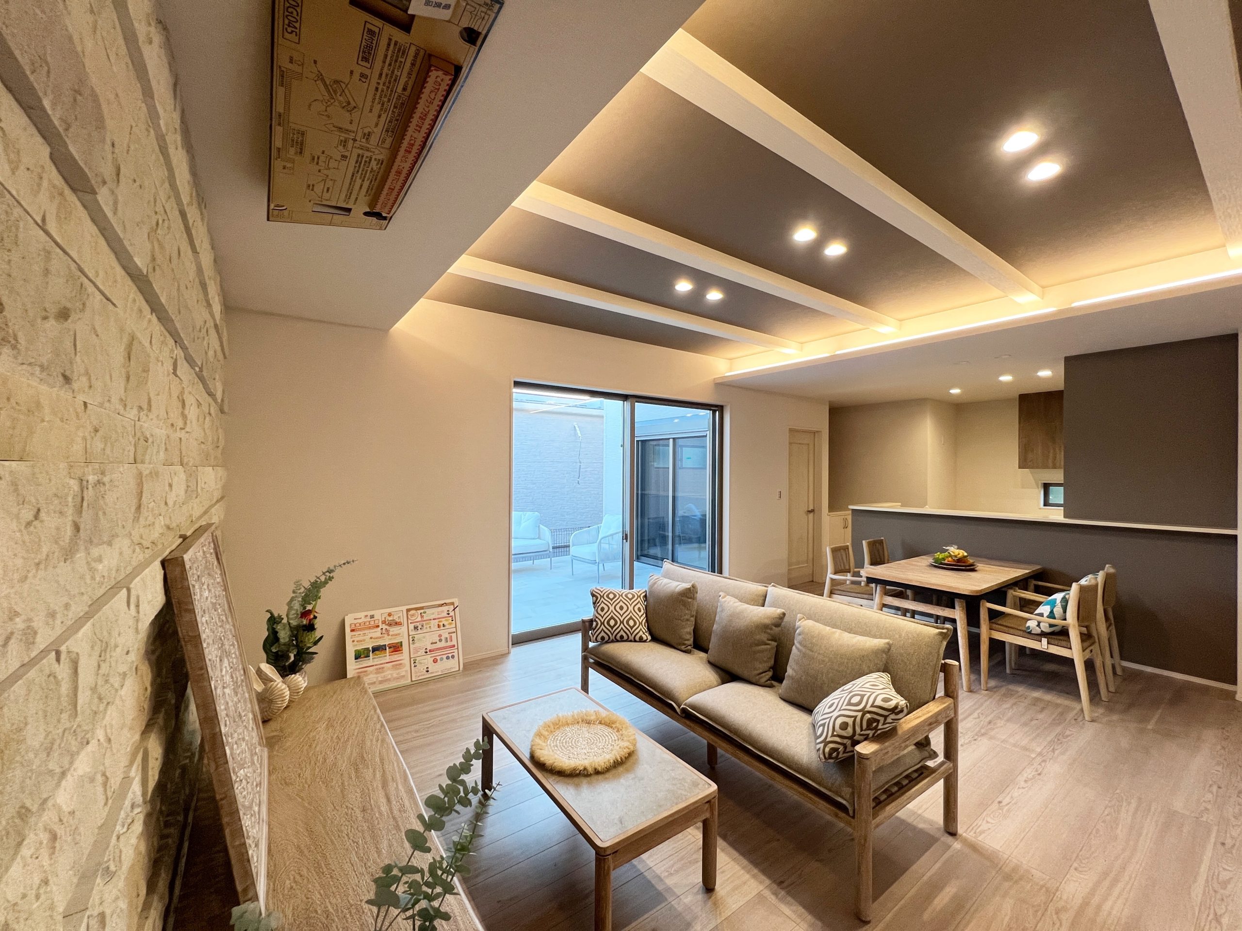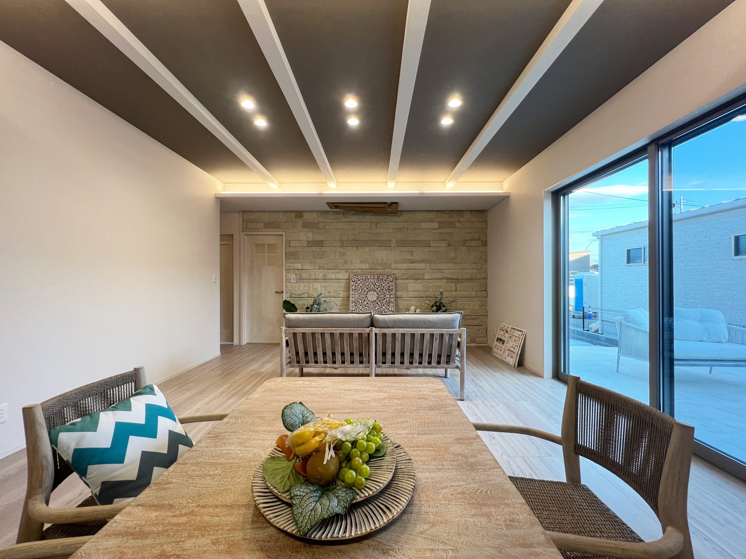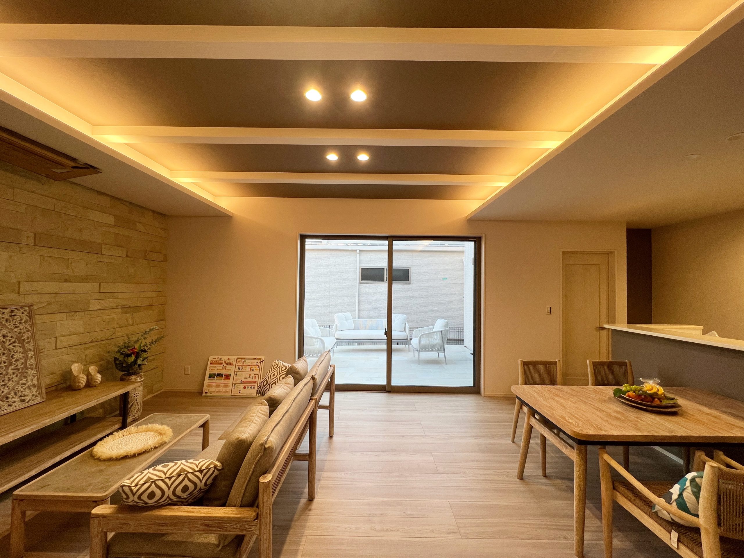 石貼りの壁と折り上げ天井の空間は、Kayu styleの家具がコーディネートされたおしゃれなリゾート。また、天カセエアコン付きです。温水式床暖房もついて、冬も足元から温かく快適です。 ※画像・パースはイメージの為、実際とは異なります。