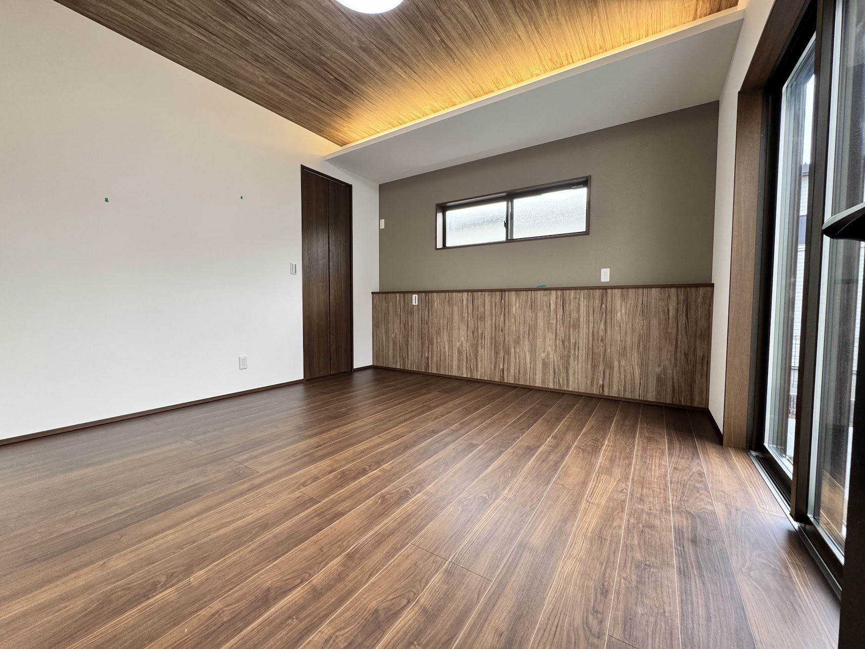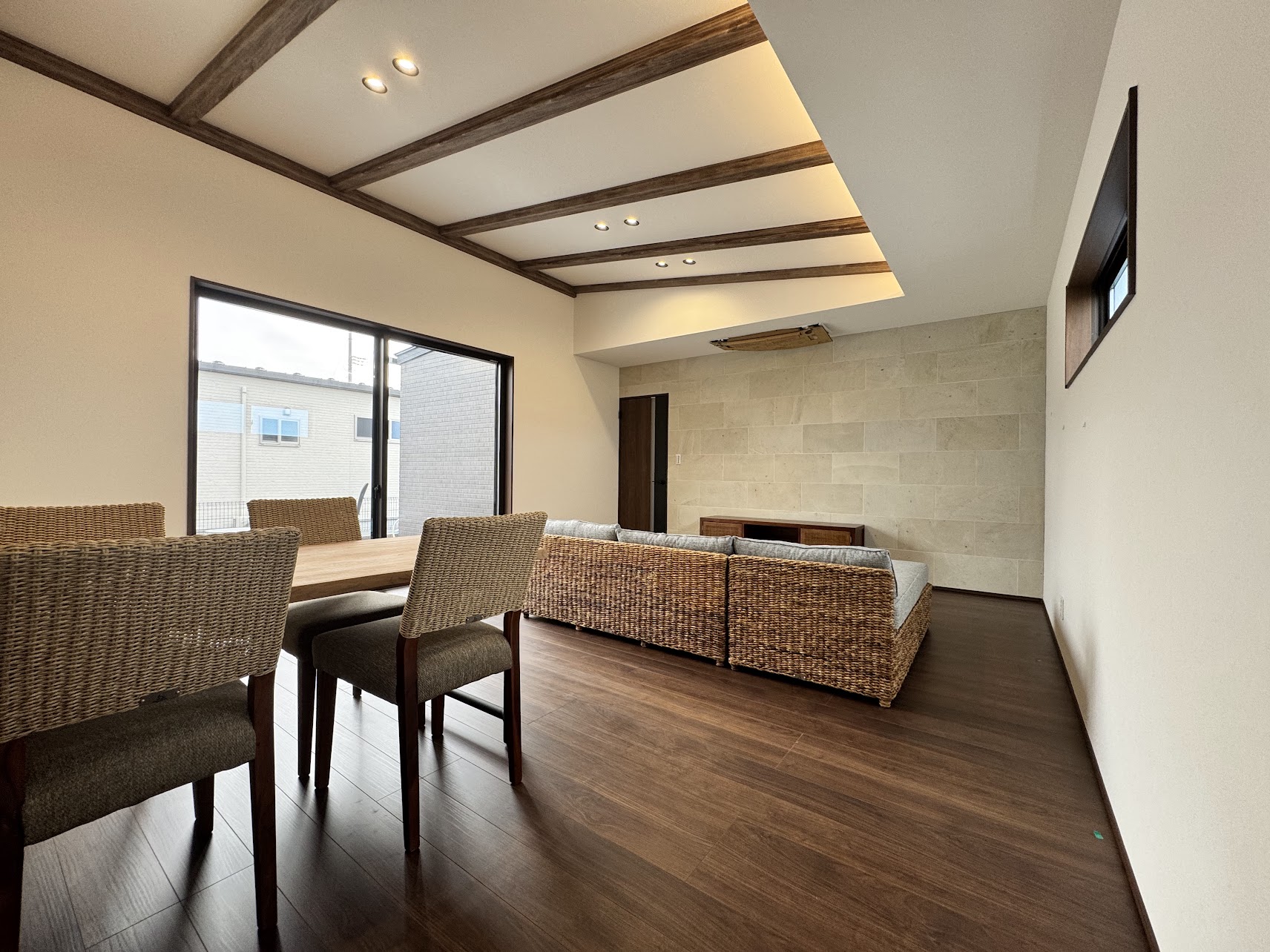 23.5帖のLDKは、ご家族で集まる憩いの場として大変ゆとりのある広さで快適にお過ごしいただけます。更にフラットにテラスと繋がっているのでBBQのときなど、ご家族の団欒や来客時に広々と使えます。