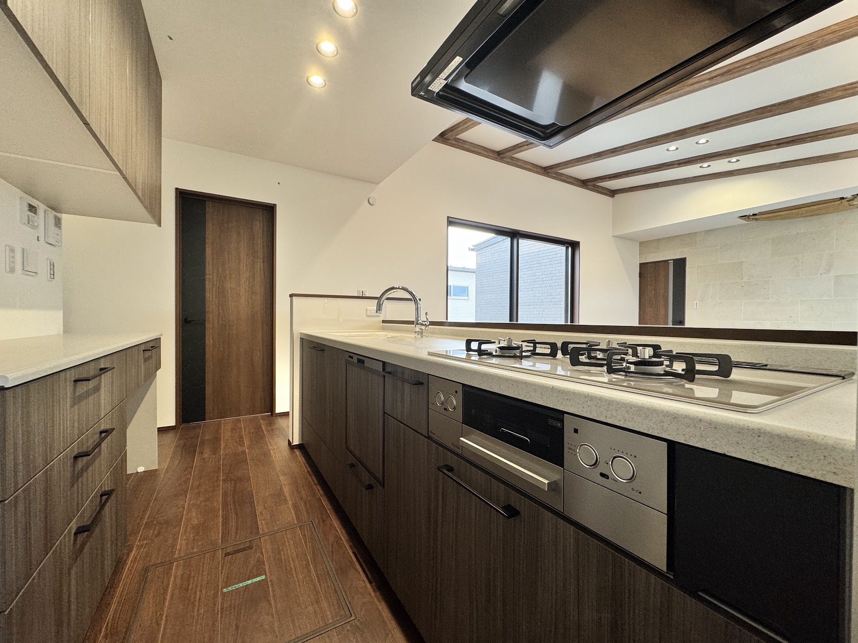 キッチンは回遊ができる配置になっているので圧迫感がなく、家事動線もらくらくです。キッチン裏には大容量パントリー、主寝室にはウォークインクローゼットがあり、収納力抜群のプランです。